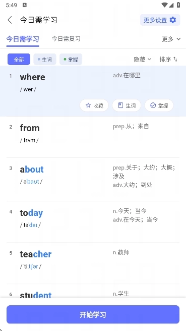4、完成后点击开始学习即可查看今日需要学习的内容