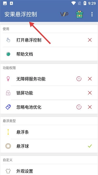 点击安果悬浮控制界面,即可启用悬浮功能,该界面包含帮助文档、功能权限设置选项,还能选择悬浮条或悬浮球样式,并对其外观进行个性化自定义。