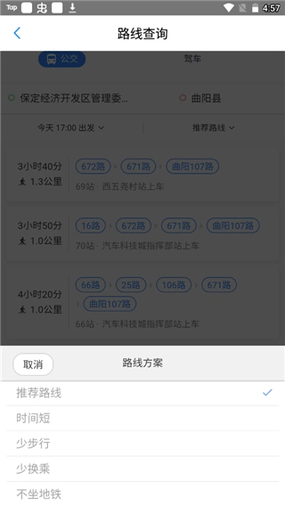 点击推荐路线后,系统会为用户呈现涵盖不同时间段、更少步行距离、更少换乘次数等多种类型的路线推荐。