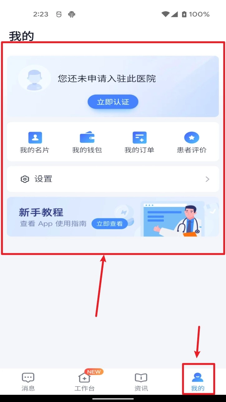 回到“我的”页面,点击“立即认证”完成医院认证,即可解锁全部功能模块。