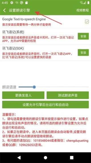 1、进入朗读引擎设置界面,可选择Google等引擎,支持调节语速、切换发音人,还配有使用提示说明。