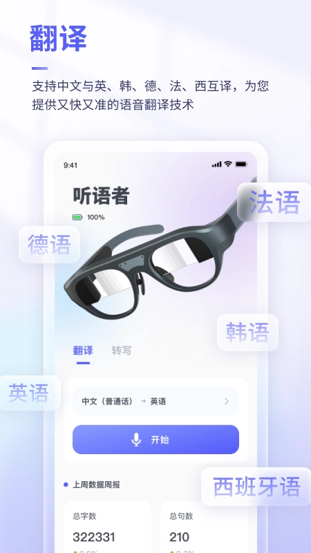 可译App是北京亮亮视野科技有限公司推出的专业翻译工具,该软件需配合LEION HEY智能眼镜使用,能够帮助用户快速将声音实时转化为文字。App支持中、英、韩、德、法等多种语言翻译,可在不同语言间自由切换,在线实时翻译十分便捷,主要面向听障用户,有需求的朋友不妨尝试体验。