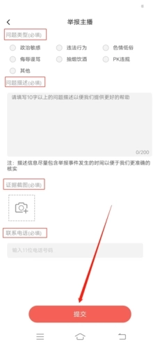 此时我们便进入了举报界面,需要填写举报的类型、相关描述、证据截图以及你的联系电话,在确认所有信息准确无误后,点击下方的“提交”按钮,就能完成举报操作。