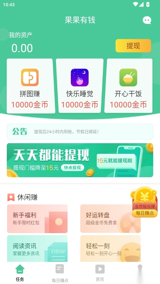 果果有钱是一款提供大量兼职工作的软件,用户可以随时在这里做兼职赚外快,软件中推荐了大量优质的岗位工作,用户可以自由选择自己喜欢的岗位工作报名,超多的高薪工作用户可以任意挑选报名参与工作,可利用自己的休闲时间在这里兼职赚钱,增加收入,支持用户将自己的收入随时提现使用,提现到个人账户管理更方便,同时还方便用户随时与招聘方即时沟通联系方便对接工作,其中还推送了很多的阅读资讯内容,用户可以对各种资讯内容进行全面的阅读查看,了解更多精彩资讯信息,有需要的用户就快来果果有钱使用吧!