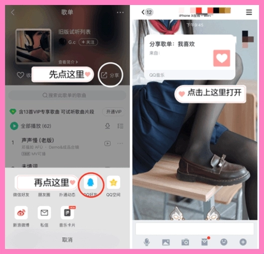 1、第一步打开小Q音乐,进入个人歌单页面,先点击“分享”按钮,再将歌单发送给自己(或他人均可,只要能获取到歌单链接就行),之后打开刚分享的链接。
