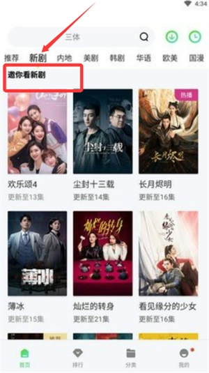 首页推荐区域设有“邀你看新剧”板块,用户可通过该板块浏览最新上线的剧集。