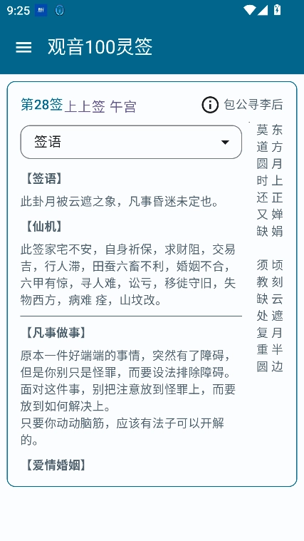 观音100灵签软件是一款趣味类应用。在日常生活里,不少人碰到事情时总爱求神拜佛,而抽签便是其中一种常见方式。这款观音100灵签手机版能让你体验抽签和解签的过程,但请大家别太较真,把它当成一款增添乐趣的软件就好。