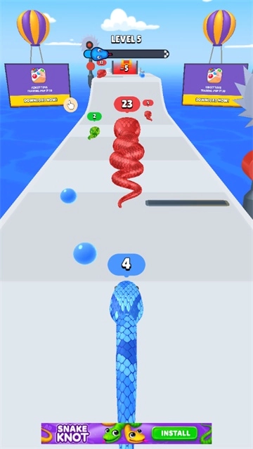 在《合并蛇》游戏里,玩家得吃掉其他比自身蛇身短的蛇,以此让自己的蛇变长,这样就能让跑酷过程更久,从而顺利通过关卡。不过要注意,不能去攻击那些比自己蛇身长的蛇,不然游戏就会重新开始。