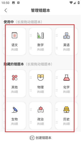 3、进入错题本管理界面后,能直观看到“使用中”和“隐藏”两类错题本;长按错题本分类可拖动调整排序,同时支持创建新的错题本。
