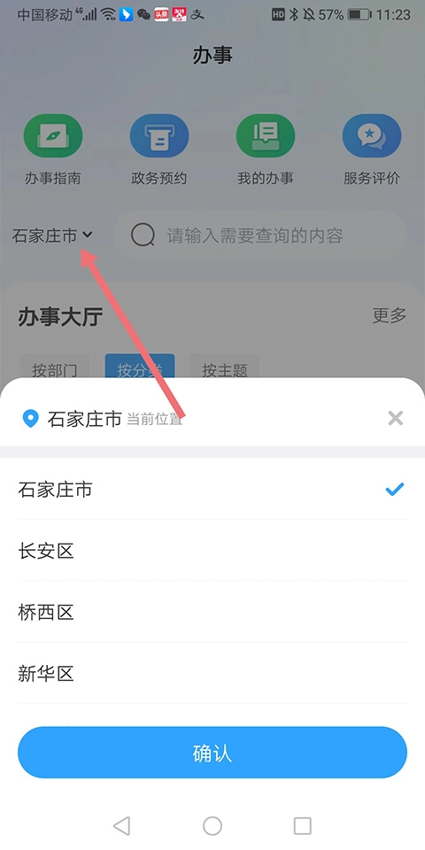 用户打开后进入办事页面,可点击搜索框(下图红色箭头所指位置)