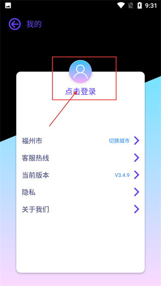 点击头像即可进入【我的】页面,该页面设有【点击登录】按钮,同时还能看到【福州市】-切换城市、【客服热线】等功能选项。