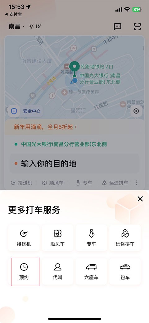 1、在本站并打开滴滴出行,登录我们的账号后回到首页,点击下图位置的预约选项