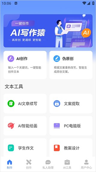 ai写作猿是一款非常好用的智能写作助手工具平台,该软件是由合肥术图信息科技有限公司所开发,它主要能够根据用户输入的关键词或标题,一键生成文章、文案、摘要等文本内容,从而提供丰富的模板和改写、续写、扩写等编辑功能,帮助用户快速获取创作灵感。同时,这款ai写作猿还具备AI对话功能,能够解答各种问题,提供学习、医疗、法律等领域的高效咨询服务,在帮助用户高效写作的同时,更加提升了日常生活的便捷性。