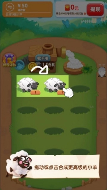 玩家可以通过拖动两只等级相同的小羊来合成,从而获得等级更高的小羊。每次合成操作都能领取红包奖励,而且合成出的绵羊等级越高,对应的红包金额就会越大。