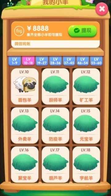 3、把小羊升级到10级,就能解锁更高级别的小羊。合成的时候,收益会增加一倍,让你感受到更快的收益速度。