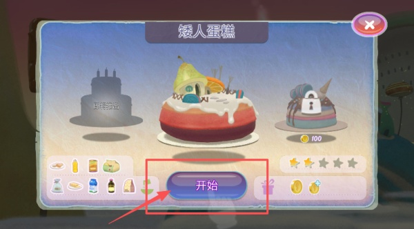 2、按下紫色的开始键,选择矮人蛋糕这个项目开始制作,解锁该项目需要消耗100金币。