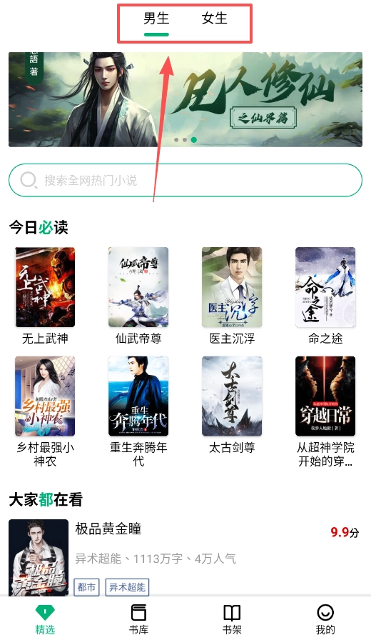 打开软件后,首页设有“男生”和“女生”两个分类板块,直接点击对应的分类即可进入阅读界面开始阅读。