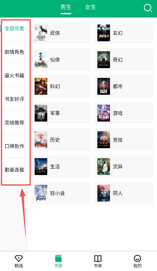 若想查找特定类型的小说,可点击顶部的“全部分类”选项,其中包含“武侠”“仙侠”“都市”“玄幻”等具体分类。