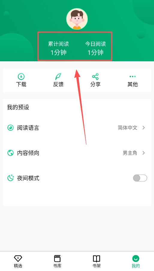 3、点击底部的“我的”,既能查看阅读时长记录,也能对“阅读语言”和“内容倾向”进行设置。