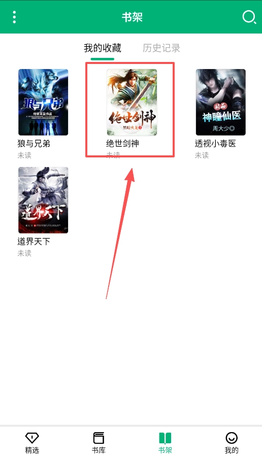 4、你收藏的小说都在“书架”中,在“我的收藏”和“历史记录”里,同样可以快速找到最近阅读过以及正在追更的书籍。