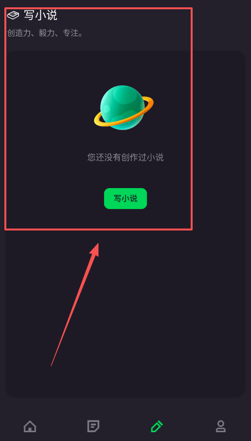 1、打开软件就点“写小说”,其他功能都可以在写作过程中按需使用,简洁的界面设计让新手也能快速上手。