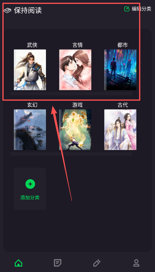 2、需要素材时去“保持阅读”板块看看,常见的小说类型都已分类整理好,觉得不够用还能自己添加新分类。