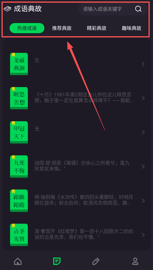 3、写作卡顿时试试成语典故功能,不记得完整成语时输入关键字也能搜索到,例句展示方式对学习用法很有帮助。