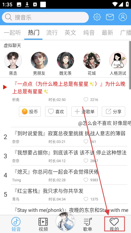 1、若想管理个人音乐相关内容,点击右下角的【我的】按钮即可,进入个人页面十分便捷。