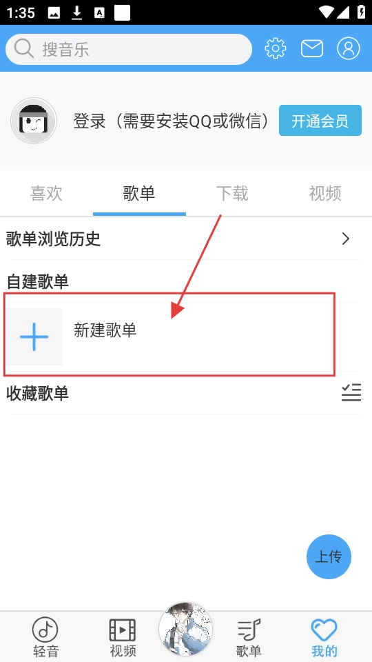 3、进入歌单区域后,点击【新建歌单】按钮,即可创建专属自己的歌单。