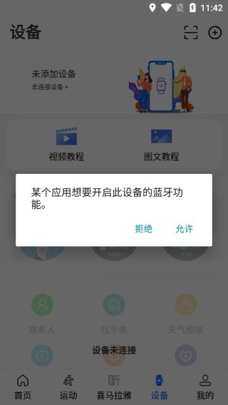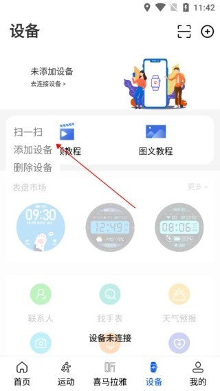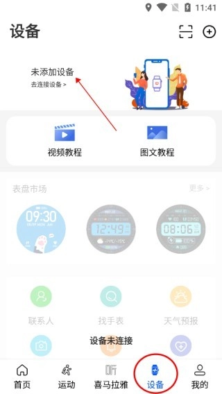 打开WearinOS软件,进入图示的设备页面后,点击页面上方的“为添加设备,去连接设备”选项。