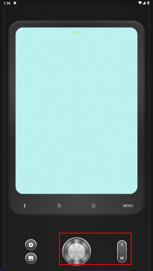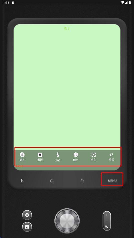 点击底部的旋钮按钮就能完成拍照,通过调节t-w可以改变画面的显示效果。