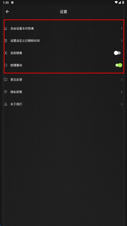 在设置页面中,您可以对自由设置水印效果、自定义日期时间等功能进行调整。