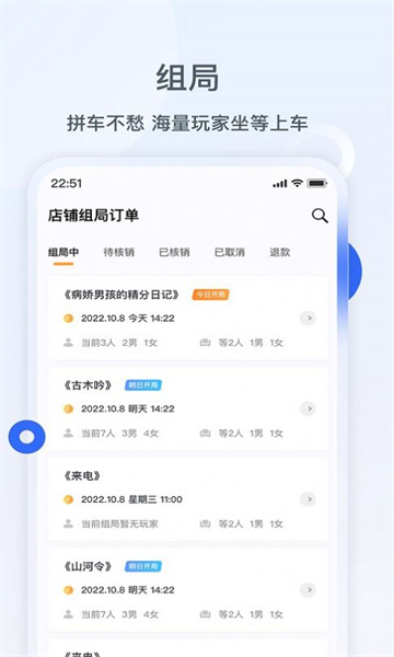 接收波吉用户组局下单或打本订单,开局剧本、开局时间、参局人数信息清晰明了,扫码核销操作便捷高效。