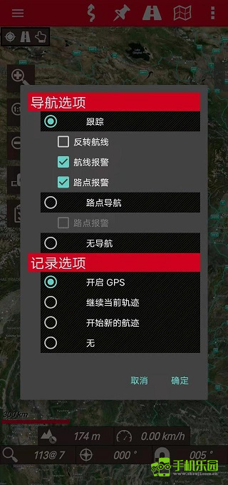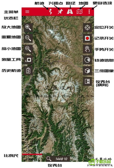 上图便是Oruxmaps的基本界面,其中使用较多的功能:定位开关、记录开关、手势开关、测量工具,以及菜单中的航迹、路径、地图。从这一界面开始便是软件的正式界面了,首先可以尝试点击右侧“定位开关”去尝试软件是否正常运行了,如屏幕中心出现红色箭头,那么软件运行已正常。如果版本不同,主界面可能会有细微区别,但是主要功能是基本一样的,无需过于在意是否最新版,6.x-7.x版本均可以正常使用(8.x版本未作测试)。
