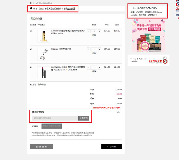 购物车右侧设有满额赠品区,只要订单金额达到£30或£50,就能免费领取对应的小样。您只需点击心仪的小样,它就会自动加入购物车。不过要注意,小样的库存是有限的,如果您发现没有可以勾选的小样选项,那就说明该赠品已经派送完毕了。