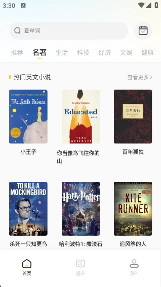 1、安装后打开软件进入首页,可浏览推荐内容或搜索感兴趣的英文读物;