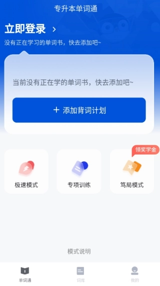 1、进入主页即可添加背词计划,可根据需求设置极速模式或专项训练模式;