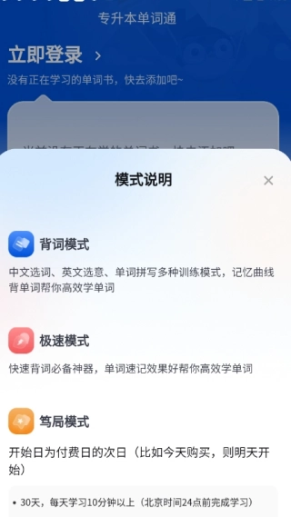 2、词库功能区附带模式说明,可按需挑选最适配的学习方式;