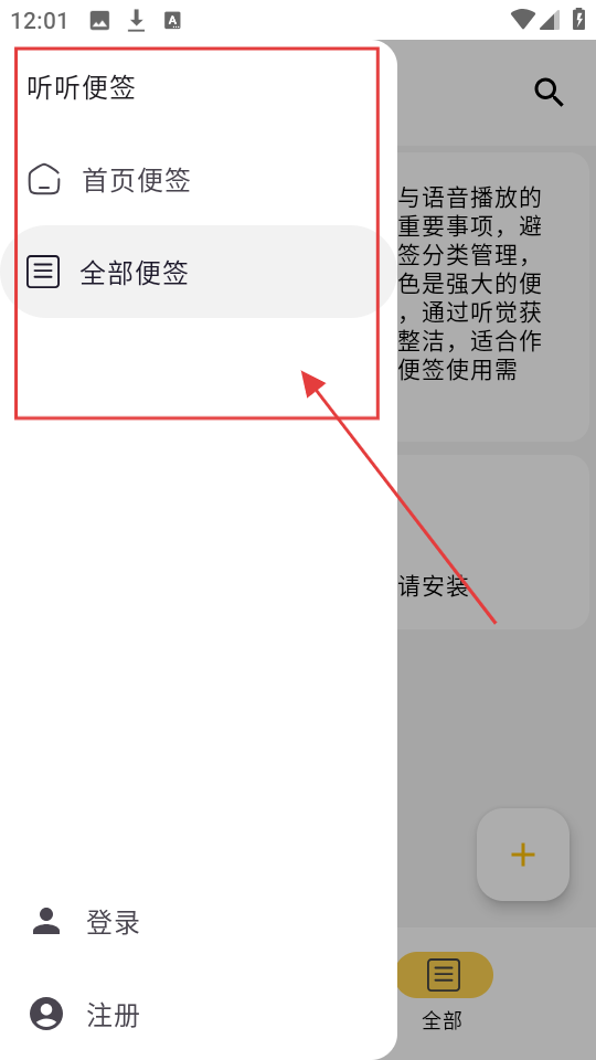 4、点击左上角的菜单按钮,即可选择【首页便签】或【全部便签】选项,通过快速切换视图,让便签管理变得更加轻松便捷。