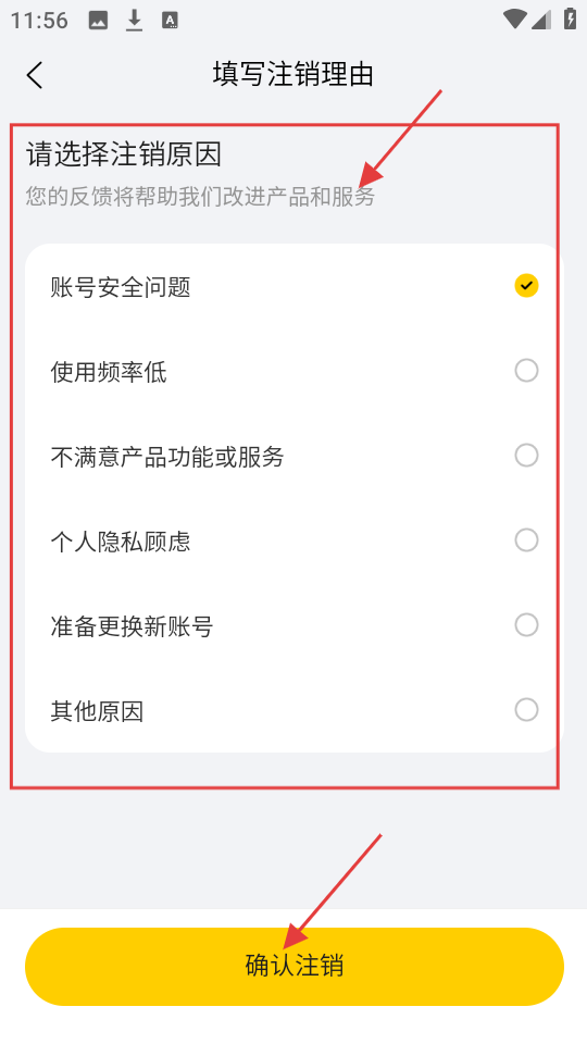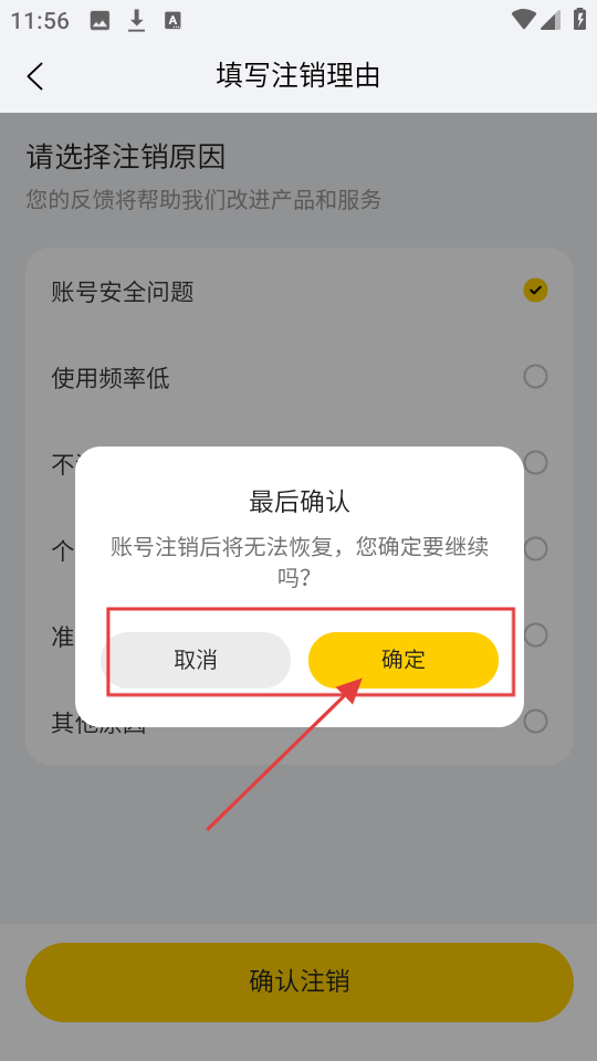 3、进入注销理由填写页面,选择注销原因(例如【账号安全问题】),选定后点击【确认注销】,进入最终确认环节。