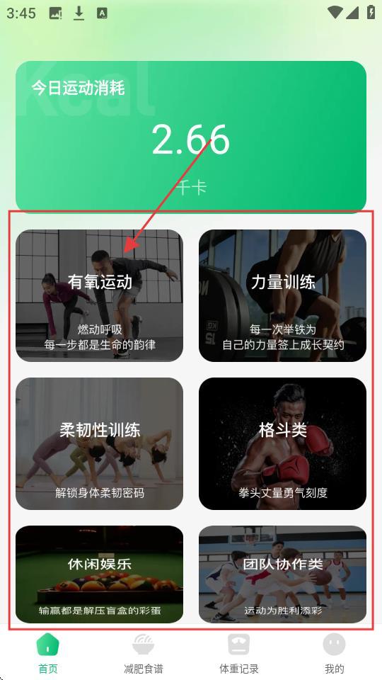 进入首页后,能看到【有氧运动】【力量训练】等运动分类板块,选择【有氧运动】分类,即可查看跑步、游泳等具体的运动项目。