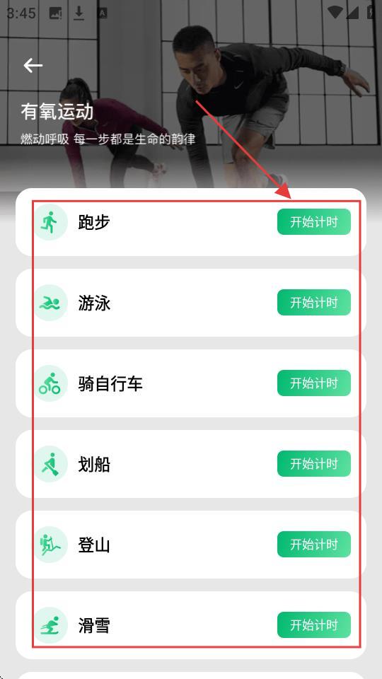 在有氧运动页面,设有跑步、游泳等运动项目,您可以选择想要进行的运动(例如跑步),然后点击【开始计时】按钮,即可启动该运动的计时功能。