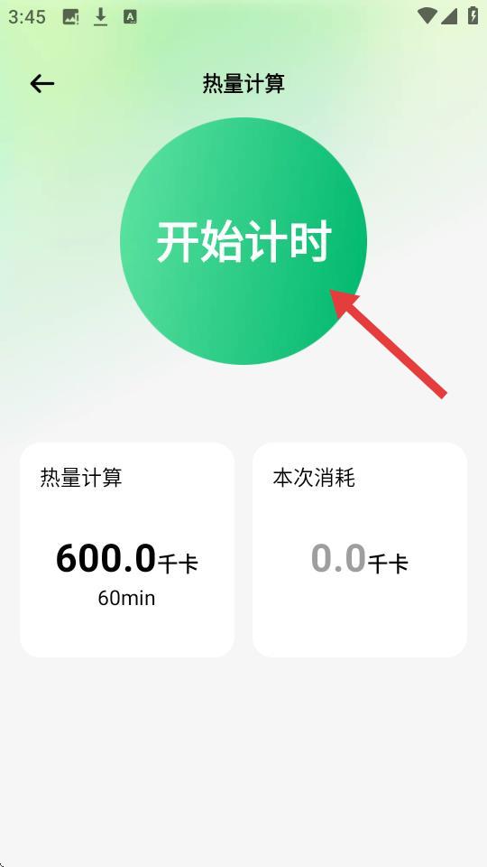 3、进入热量计算页面后,点击【开始计时】按钮,系统便会记录下你的运动时长与消耗的热量,帮助你清晰掌握运动过程中的能量消耗情况。