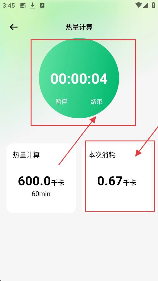 4、运动计时启动后,能查看计时时长与本次消耗的热量,若想结束运动,点击【结束】按钮,计时就会停止并显示最终的消耗数据。