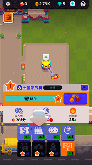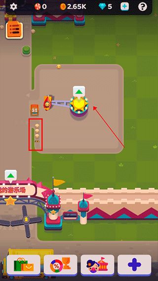 把游乐设施安置妥当后,就会有游客前来游玩,图里的小表情代表的就是游客,点击设施上的“绿色箭头”就能继续升级。