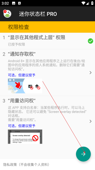 1、打开迷你状态栏pro,点击【置顶权限】。