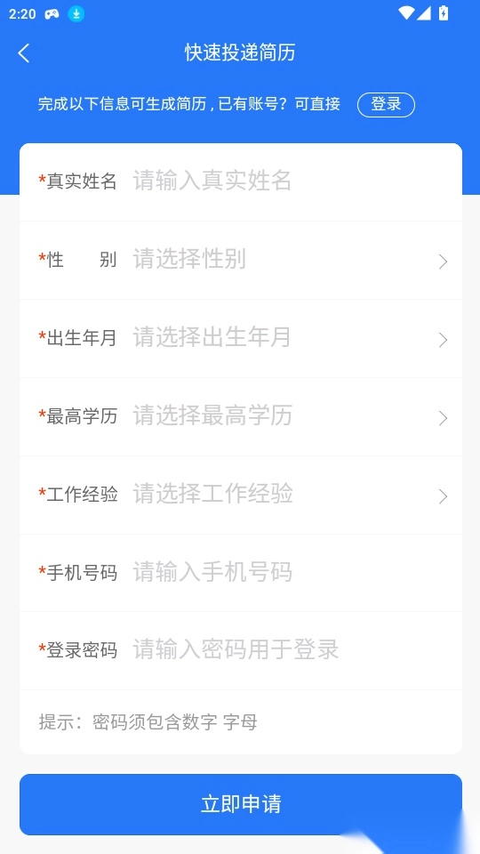 4.将你的姓名、性别、最高学历、工作经验等相关信息详细填写后点击“立即申请”即可