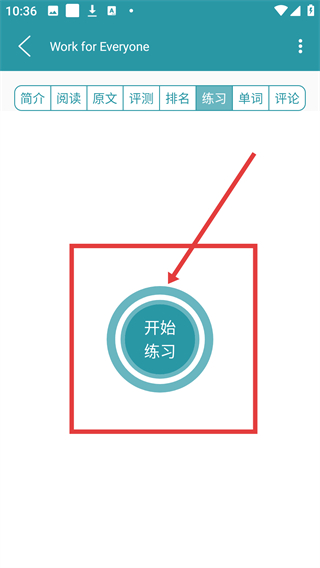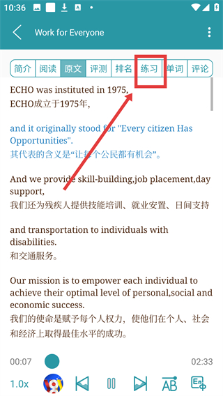 2、进入文章页后,点顶部的【练习】选项,可切换到练习板块,准备进行内容相关练习哦。