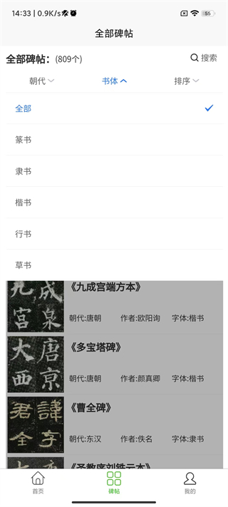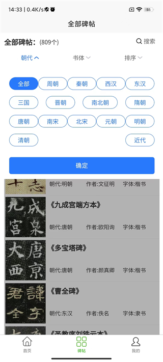 进入首页后,点击第二个选项“碑帖”,你就能看到目前所有朝代的碑帖内容。