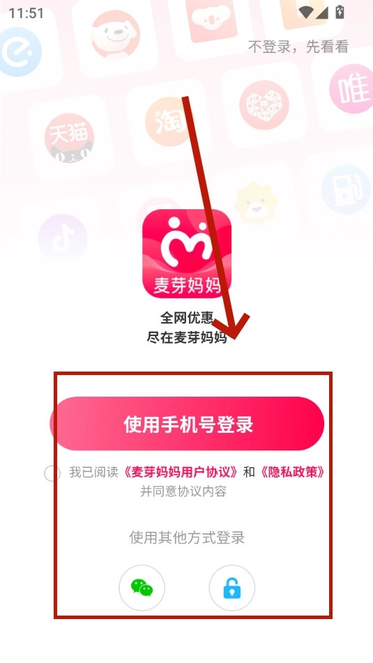 目前,麦芽妈妈已与淘宝、天猫、京东、拼多多、唯品会、抖音、苏宁易购、美团、饿了么、大众点评、滴滴出行、飞猪、携程旅行等主流平台达成深度合作,成为融合“衣食住行游购娱”的综合性生活服务入口。安装并打开麦芽妈妈应用,然后点击“同意并接受”按钮。